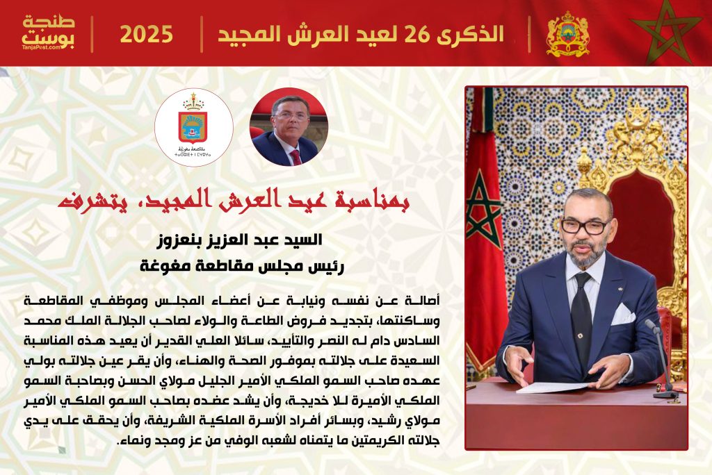 بمناسبة حلول الذكرى السادسة والعشرين لتربع صاحب الجلالة الملك محمد السادس نصره الله وأيده على عرش أسلافه المنعمين، وفي أجواء تعمها مشاعر الفخر والوفاء، يتشرف السيد عبد العزيز بنعزوز، رئيس مجلس مقاطعة مغوغة بطنجة، أصالة عن نفسه ونيابة عن أعضاء المجلس وموظفي المقاطعة وساكنتها، برفع أحر التهاني وأصدق عبارات التبريك إلى المقام السامي لصاحب الجلالة، مجددًا فروض الطاعة والولاء، ومعبّرًا عن أسمى مشاعر الوفاء والارتباط المتين بالعرش العلوي المجيد.