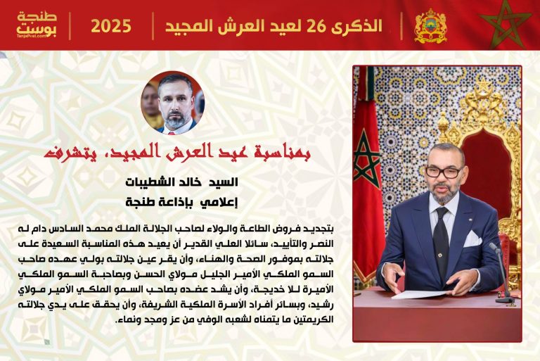 بمناسبة حلول الذكرى السادسة والعشرين لتربع صاحب الجلالة الملك محمد السادس نصره الله وأيده على عرش أسلافه الميامين، وفي أجواء مفعمة بالفخر والاعتزاز، يتشرف السيد خالد الشطيبات، إعلامي بإذاعة طنجة، أصالة عن نفسه ونيابة عن زملائه في المجال الإعلامي، بأن يرفع إلى المقام السامي لصاحب الجلالة أسمى آيات التهاني وأصدق مشاعر الولاء والطاعة.