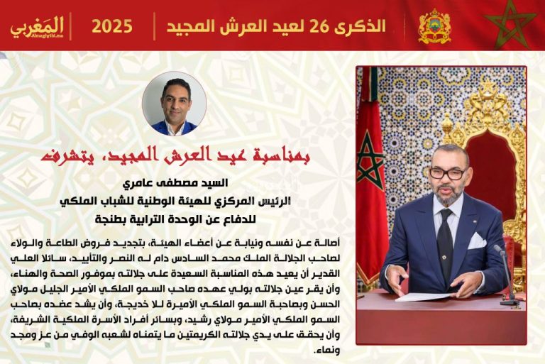 بمناسبة حلول الذكرى السادسة والعشرين لتربع صاحب الجلالة الملك محمد السادس نصره الله وأيده على عرش أسلافه المنعمين، وفي أجواء مفعمة بالفخر والاعتزاز، يتشرف السيد مصطفى عامري، الرئيس المركزي للهيئة الوطنية للشباب الملكي للدفاع عن الوحدة الترابية بطنجة، أصالة عن نفسه ونيابة عن كافة أعضاء الهيئة، برفع أسمى آيات التهاني وأصدق عبارات الولاء والطاعة إلى المقام السامي لصاحب الجلالة، معبراً عن أعمق مشاعر الوفاء والإخلاص والارتباط المتين بالعرش العلوي المجيد.